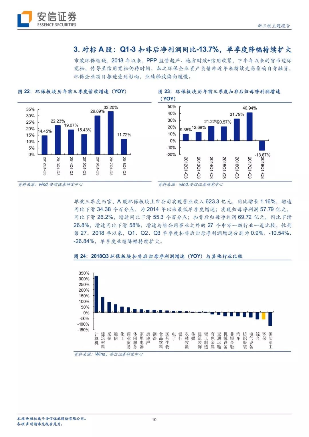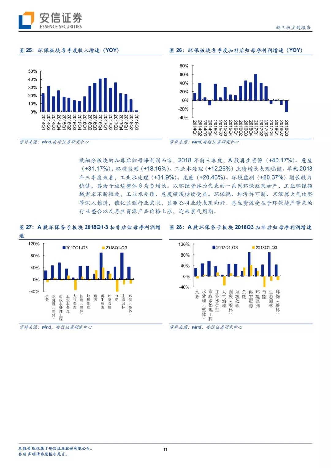 從政策進展看環(huán)境變遷路徑,環(huán)境治理已經(jīng)實現(xiàn)圍繞大氣+水+土壤三大維度建立起“環(huán)保稅+排污許可證”兩大保障、從城市走向農(nóng)村的一體化大環(huán)保格局。自年初環(huán)保稅、排污許可證實施以來,政策力度不減且頻頻出臺,在肯定我國環(huán)境治理已取得階段性的勝利的同時,進行大氣、水、固廢、土壤等細分領域的深化推進。我們對于2018年以來各細分板塊政策及變遷進行了梳理。而新三板擁有400家公司,覆蓋了大氣治理、水治理、固廢治理等各個領域。我們繼續(xù)看好環(huán)保板塊,建議從政策推進進程中發(fā)掘潛在機會,建議關注水治理、固廢治理和再生資源板塊投資機會。