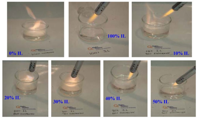 2010年來(lái)自加拿大的一項(xiàng)研究表明,如果向傳統(tǒng)的鋰離子電池電解液中加入質(zhì)量分?jǐn)?shù)為40%的離子液體,電池的性能并沒(méi)有受到明顯的影響,但電解液的易燃性顯著降低,即便面對(duì)明晃晃的火焰也不會(huì)燃燒。有了這樣的電解質(zhì),鋰離子電池的安全隱患或許將徹底成為歷史。