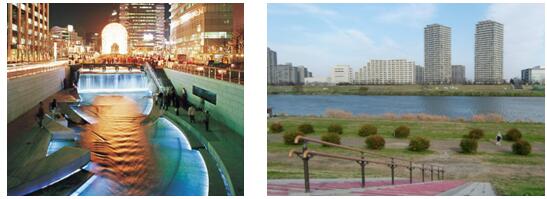 請注意概念中的“有限度”和“輔助”兩詞,在水生態(tài)修復中起決定作用的仍應為自然修復,工程僅為輔助河(湖)自我修復過程。圖1中左圖為清溪川城市段,其之所以在治理后得到很多人贊許,并非因為其生態(tài)性,而因其景觀優(yōu)美,景雖美卻無處不流漏出人工斧鑿的痕跡,圖1右圖為多摩川城市段,其雖不如清溪川華麗卻有著“清水出芙蓉,天然去雕飾。”的渾然天成的美感。