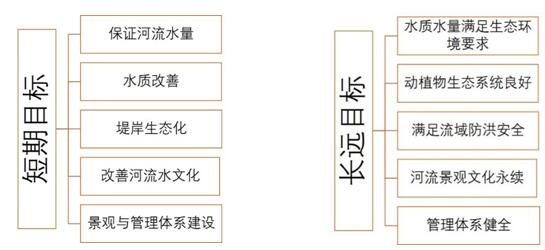 短期目標,一般以某條河流目前需要解決的主要面臨的問題為主要目標,但必須與長遠目標相銜接,兩者統(tǒng)籌考慮,分段實施,短期目標內(nèi)容因依不同城市河流及其存在的主要問題來設置。