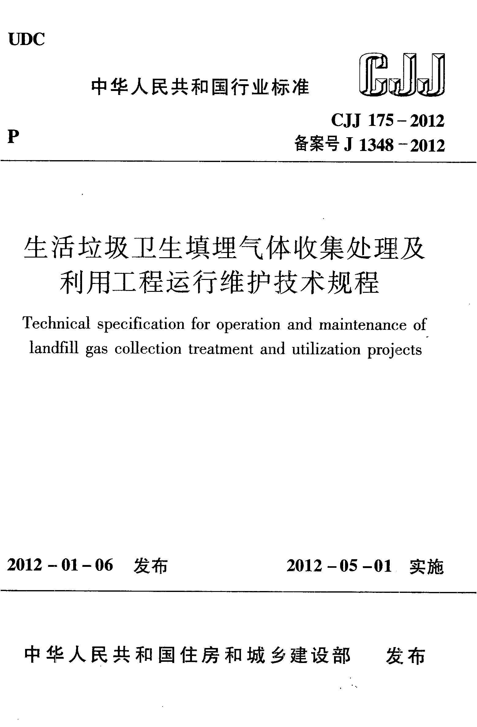 生活垃圾衛(wèi)生填埋氣體收集處理及利用工程運行維護技術(shù)規(guī)程(CJJ/T 175-2012)