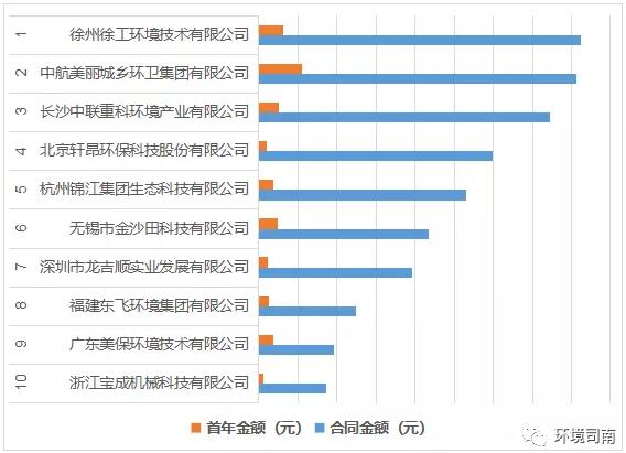 其中:“徐州徐工環(huán)境技術(shù)有限公司、中航美麗城鄉(xiāng)環(huán)衛(wèi)集團有限公司、長沙中聯(lián)重科環(huán)境產(chǎn)業(yè)有限公司、杭州錦江集團生態(tài)科技有限公司、深圳市龍吉順實業(yè)發(fā)展有限公司”等10家公司共中標(biāo)17個項目,合同總金額49.53億元,中標(biāo)項目首年服務(wù)費總金額4.34億元。
