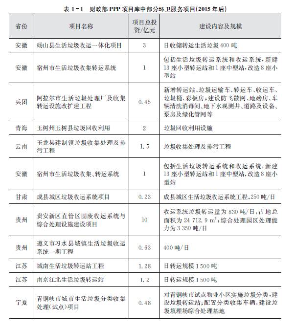 2015年開始,PPP模式在各地公用市政行業(yè)全面展開,業(yè)內(nèi)人士稱之為PPP元年。伴隨整個市場大環(huán)境,環(huán)衛(wèi)服務(wù)行業(yè)的市場化也已經(jīng)大幕開啟,越來越多的環(huán)衛(wèi)領(lǐng)域的項目開始公開招標。各地開始出現(xiàn)一些分包作業(yè)或者環(huán)衛(wèi)一體化PPP項目,包含垃圾清運、道路清掃、設(shè)施維護等環(huán)衛(wèi)作業(yè)內(nèi)容,或打包招標。較為典型的是2015年??谑协h(huán)衛(wèi)一體化建設(shè)全面引入PPP模式項目,4個區(qū)分別由北京環(huán)衛(wèi)集團、龍馬環(huán)衛(wèi)和深圳玉禾田公司中標。2015年財政部建立的PPP項目庫中首次出現(xiàn)了17個環(huán)衛(wèi)項目,總規(guī)模約42億元,主要以垃圾清運項目為主。截至目前通過2015年財政部建立的PPP項目庫檢索生活垃圾相關(guān)的PPP項目,有多達202條項目記錄,包含生活垃圾清運、轉(zhuǎn)運、分揀、終端處理設(shè)施新建和改擴建等項目。
