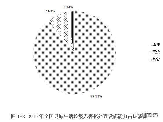 2015全國縣城生活垃圾無害化處理設(shè)施共有1187座,無害化處理量為5259.94萬噸,比2014年分別增長5.14%和10.35%。目前,衛(wèi)生填埋無論從設(shè)施數(shù)量和處理能力依舊是我國縣城垃圾無害化處理最主要方式。2015年衛(wèi)生填埋場1108座,比上一年新增53座;填埋無害化處理能力157615噸/日,年無害化處理量為4688.26萬噸,占縣城生活垃圾無害化處理總能力的89.13%,與去年89.41%基本持平。2015,全國縣城焚燒廠37座,較去年增長了3座;無害化處理總量401.43萬噸,較2014年的344.1萬噸,增長了16.66%,但占縣城生活垃圾無害化處理總能力比例只稍微提升了0.41%。其他無害化處理設(shè)施,2015年縣城共有42座,較2014年的40座,只增長了2座,總的處理量與2014年相比也只增長了9.42萬噸。縣城生活垃圾的處理設(shè)施和能力未發(fā)生明顯變化。