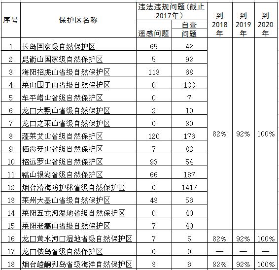 (二)自然保護區(qū)違法違規(guī)問題。2018年底前,國家級、省級自然保護區(qū)突出問題82%以上完成整改并開展驗收銷號。2019年底前,國家級、省級自然保護區(qū)突出問題92%以上完成整改并開展驗收銷號。2020年底前,國家級、省級自然保護區(qū)突出問題100%完成整改并開展驗收銷號。