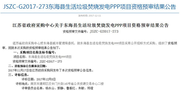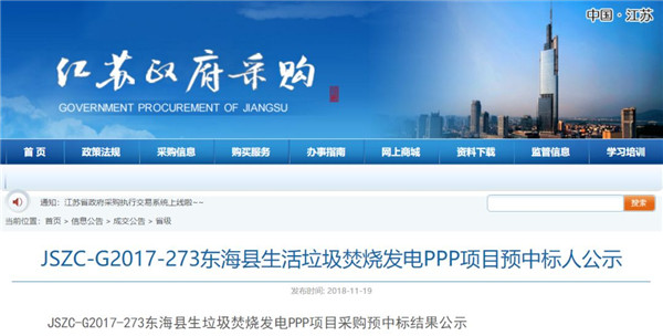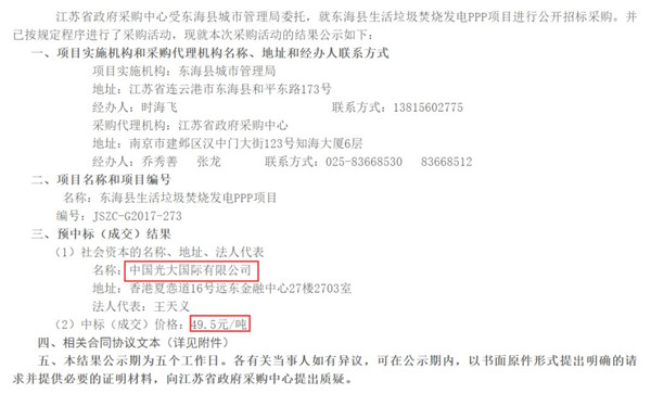 19日江蘇政府采購(gòu)網(wǎng)發(fā)布了《JSZC-G2017-273東??h生活垃圾焚燒發(fā)電PPP項(xiàng)目預(yù)中標(biāo)人公示》,公示顯示,光大國(guó)際以49.5元/噸的價(jià)格成為預(yù)中標(biāo)人,相關(guān)的信息如下: