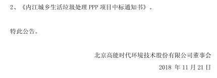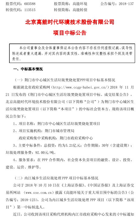 11月21日,高能環(huán)境發(fā)布公告稱,公司中標荊門市中心城區(qū)生活垃圾焚燒處置PPP項目,該總投資約為5.21億元;公司為牽頭方的聯(lián)合體中標內江城鄉(xiāng)生活垃圾處理PPP項目,該項目估算總投資約為22.59億元。公告如下: