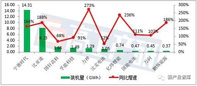 從裝機量TOP10企業(yè)排名來看,1-10月動力電池企業(yè)裝機量排名與去年同期相比7-10位均為新晉企業(yè),分別為億緯鋰能、國能電池、萬向、鵬輝能源,此四家企業(yè)裝機量同比增速均在100%以上。