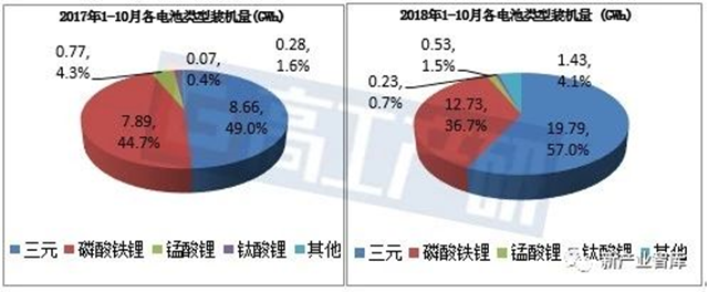 從各電池類型裝機量來看,1-10月磷酸鐵鋰動力電池裝機量合計達(dá)12.73GWh,占比36.7%,較去年同期占比下降8個百分點;1-10月三元動力電池裝機量合計達(dá)19.79GWh,占比57.0%,較去年同期占比上升8個百分點。