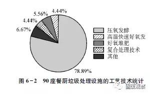 對已知處理工藝的90座處理設(shè)施的統(tǒng)計(jì)分析表明,以厭氧發(fā)酵為主的處理設(shè)施占78.89%,采用高溫快速好氧發(fā)酵的設(shè)施占6.67%,采用好氧堆肥的設(shè)施占4.44%,固液分離后液體厭氧、固體堆肥或制飼料(復(fù)合處理)的設(shè)施占5.56%,采用其他處理技術(shù)的占4.44%。厭氧發(fā)酵仍然是主流技術(shù)。