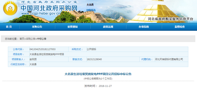 2018年11月27日,河北省大名縣生活垃圾焚燒發(fā)電PPP項目發(fā)布中標公告,上海康恒環(huán)境股份有限公司成為中標的社會資本方,垃圾處理服務(wù)費單價為57元/噸。
