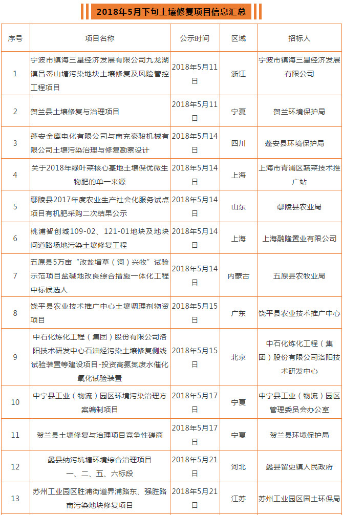 5月下旬土壤修復(fù)重點(diǎn)項(xiàng)目信息匯總