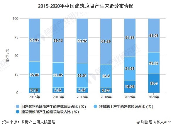 1、6成以上建筑垃圾來自于拆除舊建筑時(shí) 根據(jù)建筑垃圾的來源劃分,我國(guó)建筑垃圾的來源可劃分為舊建筑物拆除時(shí)所產(chǎn)生的建筑垃圾、現(xiàn)有建筑物裝修時(shí)所產(chǎn)生的建筑垃圾和新建建筑物在施工時(shí)產(chǎn)的建筑垃圾三大類。 根據(jù)建筑垃圾的來源劃分,2020年,我國(guó)舊建筑物拆除所產(chǎn)生的建筑垃圾占45.08%左右,建筑施工產(chǎn)生的垃...
