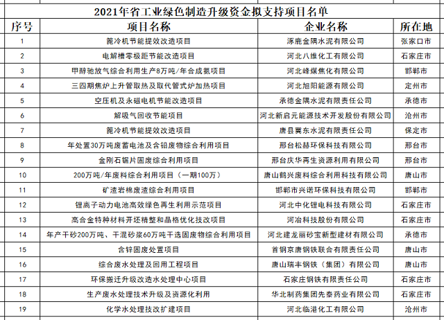 關(guān)于2021年省工業(yè)綠色制造升級資金擬支持項(xiàng)目的公示 按照《2021年河北省工業(yè)綠色制造升級資金申報(bào)指南》要求,通過各市(含定州、辛集)工業(yè)和信息化局篩選上報(bào)、專家評審、現(xiàn)場審查和集中研究等程序后,我廳擬對19個(gè)項(xiàng)目給予支持(名單詳見附件)。現(xiàn)將項(xiàng)目予以公示,請社會各界對項(xiàng)目及承擔(dān)單位相關(guān)情況進(jìn)行監(jiān)...
