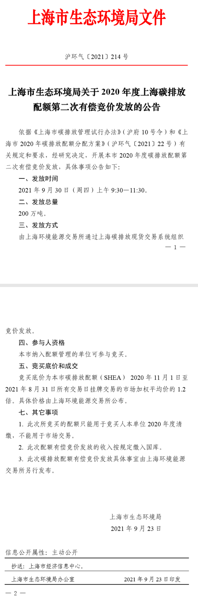 上海市生態(tài)環(huán)境局關于2020年度上海碳排放配額第二次有償競價發(fā)放的公告 滬環(huán)氣〔2021〕214號 依據(jù)《上海市碳排放管理試行辦法》(滬府10號令)和《上海市2020年碳排放配額分配方案》(滬環(huán)氣〔2021〕22號)有關規(guī)定和要求,經(jīng)研究決定,開展本市2020年度碳排放配額第二次有償競價發(fā)放,具體事...