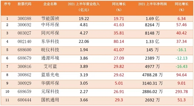 產(chǎn)業(yè)皖軍上半年報業(yè)績披露進入公眾視野:表現(xiàn)不俗鋒芒初現(xiàn)。安徽省環(huán)保產(chǎn)業(yè)發(fā)展促進會匯總了安徽環(huán)保上市企業(yè)2021年上半年業(yè)績,據(jù)不完全統(tǒng)計,目前A股有11家環(huán)保企業(yè)上半年營收全部實現(xiàn)同比增長,且平均增長幅度超過33%;凈利潤實現(xiàn)同比增長的企業(yè)占比73%,有8家企業(yè)營收凈利雙增。具體表現(xiàn)如下: 節(jié)能國禎...