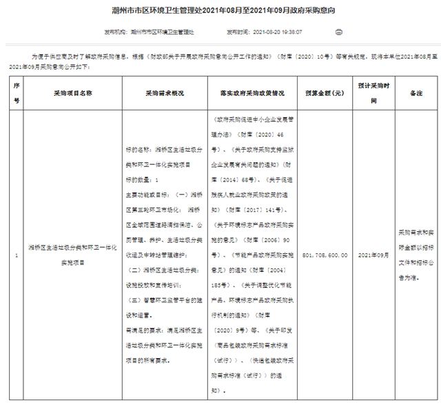 近日,中國固廢網(wǎng)從E20標訊系統(tǒng)E標通獲悉,廣東省潮州市將于9月份公開采購兩個環(huán)衛(wèi)項目,總投資超過10億!兩項目分別為湘橋區(qū)生活垃圾分類和環(huán)衛(wèi)一體化實施項目和楓溪區(qū)生活垃圾分類和環(huán)衛(wèi)一體化實施項目,預算金額分別為80170.86萬元和27852.86萬元。 項目:湘橋區(qū)生活垃圾分類和環(huán)衛(wèi)一體化實施項...