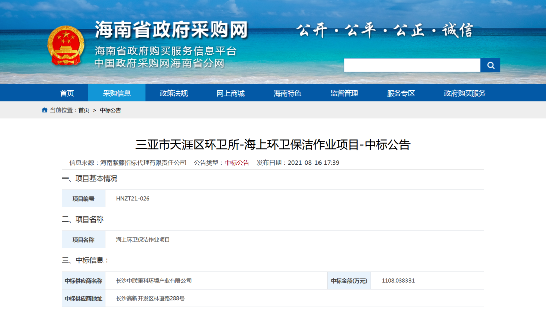 海南省政府采購(gòu)網(wǎng)消息,8月15日,三亞市天涯區(qū)環(huán)衛(wèi)所海上環(huán)衛(wèi)保潔作業(yè)項(xiàng)目公布中標(biāo)結(jié)果,盈峰環(huán)境子公司長(zhǎng)沙中聯(lián)重科環(huán)境產(chǎn)業(yè)有限公司以,中標(biāo)結(jié)果如下:中標(biāo)供應(yīng)商名稱:長(zhǎng)沙中聯(lián)重科環(huán)境產(chǎn)業(yè)有限公司中標(biāo)金額:1108.038331(萬(wàn)元) /年服務(wù)期限:3年服務(wù)內(nèi)容:海域保潔、沙灘保潔、河面保潔、護(hù)坡保潔、...