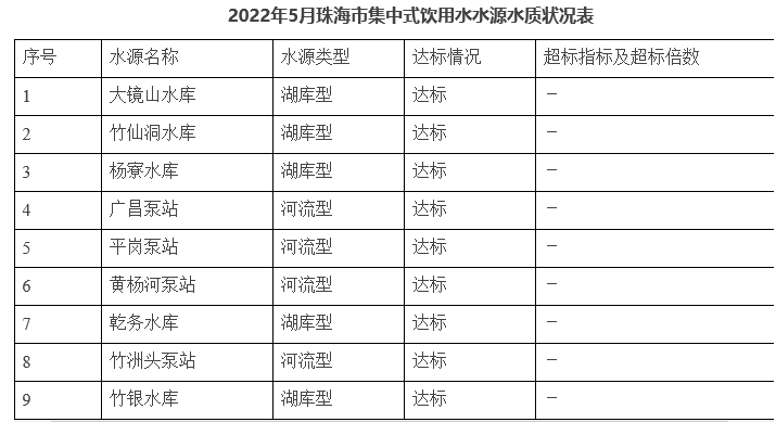 近日,珠海市生態(tài)環(huán)境局發(fā)布珠海市2022年5月集中式生活飲用水水源水質(zhì)狀況報(bào)告,監(jiān)測的9個(gè)主要集中式生活飲用水水源水質(zhì)均達(dá)標(biāo),達(dá)標(biāo)率為100%。詳情如下: 一、監(jiān)測情況 2022年,珠海市主要集中式生活飲用水水源共有9個(gè)(河流型4個(gè),湖庫型5個(gè)),分別為:廣昌泵站、平崗泵站、黃楊河泵站、竹洲頭泵站、...