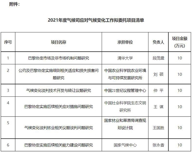 關于2021年度應對氣候變化工作擬委托項目的公示各有關單位: 根據(jù)《生態(tài)環(huán)境部財政撥款項目委托業(yè)務費管理辦法》(科財函〔2019〕226號)要求,經申報匯總、形式審核、專家評審并報應對氣候變化司領導審定,擬立項開展2021年度應對氣候變化工作委托項目共6項,現(xiàn)將項目名單公示如下: 一、公示內容 氣候...
