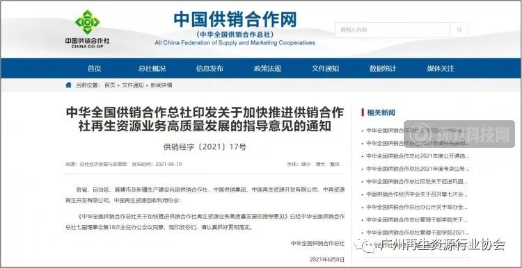文章導讀6月10日,中國供銷合作社官網印發(fā)關于加快推進供銷合作社再生資源業(yè)務高質量發(fā)展的指導意見的通知。明確到“十四五”末,全系統(tǒng)發(fā)展城鄉(xiāng)回收網點8萬個,建設綠色分揀中心2000個,綜合利用園區(qū)(基地)300個。形成“村級收集+鄉(xiāng)鎮(zhèn)轉運+縣域處理+再生資源基地綜合利用”覆蓋城鄉(xiāng)的供銷合作社再生資源回...