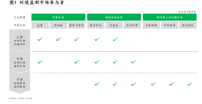 競爭現(xiàn)狀 當前環(huán)境監(jiān)測行業(yè)主要分為三大陣營,分別是外資企業(yè)、國內(nèi)設(shè)備企業(yè)及國內(nèi)第三方運維企業(yè)(如圖1)。外資企業(yè)的業(yè)務(wù)重心在上游,包括監(jiān)測所用到的分析儀器、監(jiān)測儀器的關(guān)鍵部件等;國內(nèi)設(shè)備企業(yè)的業(yè)務(wù)重心在中游,包括集成化的監(jiān)測儀器、監(jiān)測系統(tǒng)等,但有些企業(yè)正逐漸向上下游延伸,提供全產(chǎn)業(yè)鏈服務(wù);國內(nèi)第三方...