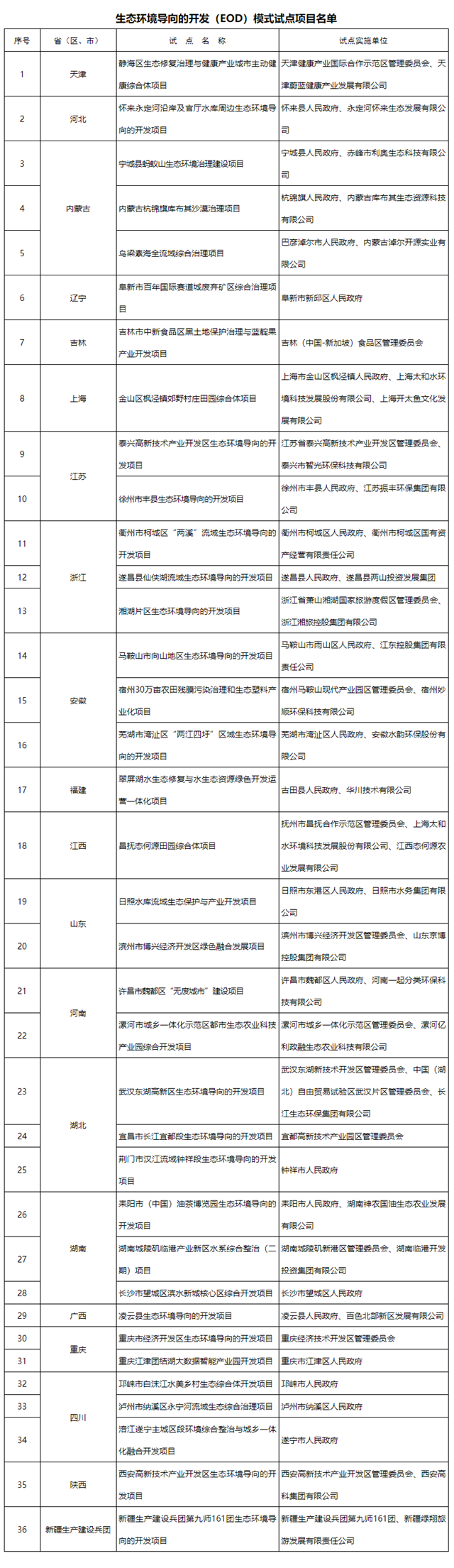 關(guān)于同意開(kāi)展生態(tài)環(huán)境導(dǎo)向的開(kāi)發(fā)(EOD)模式試點(diǎn)的通知天津市、河北省、內(nèi)蒙古自治區(qū)、遼寧省、吉林省、上海市、江蘇省、浙江省、安徽省、福建省、江西省、山東省、河南省、湖北省、湖南省、廣西壯族自治區(qū)、重慶市、四川省、陜西省、新疆生產(chǎn)建設(shè)兵團(tuán)生態(tài)環(huán)境廳(局)、發(fā)展改革委,國(guó)家開(kāi)發(fā)銀行有關(guān)分行,各試點(diǎn)實(shí)施單...