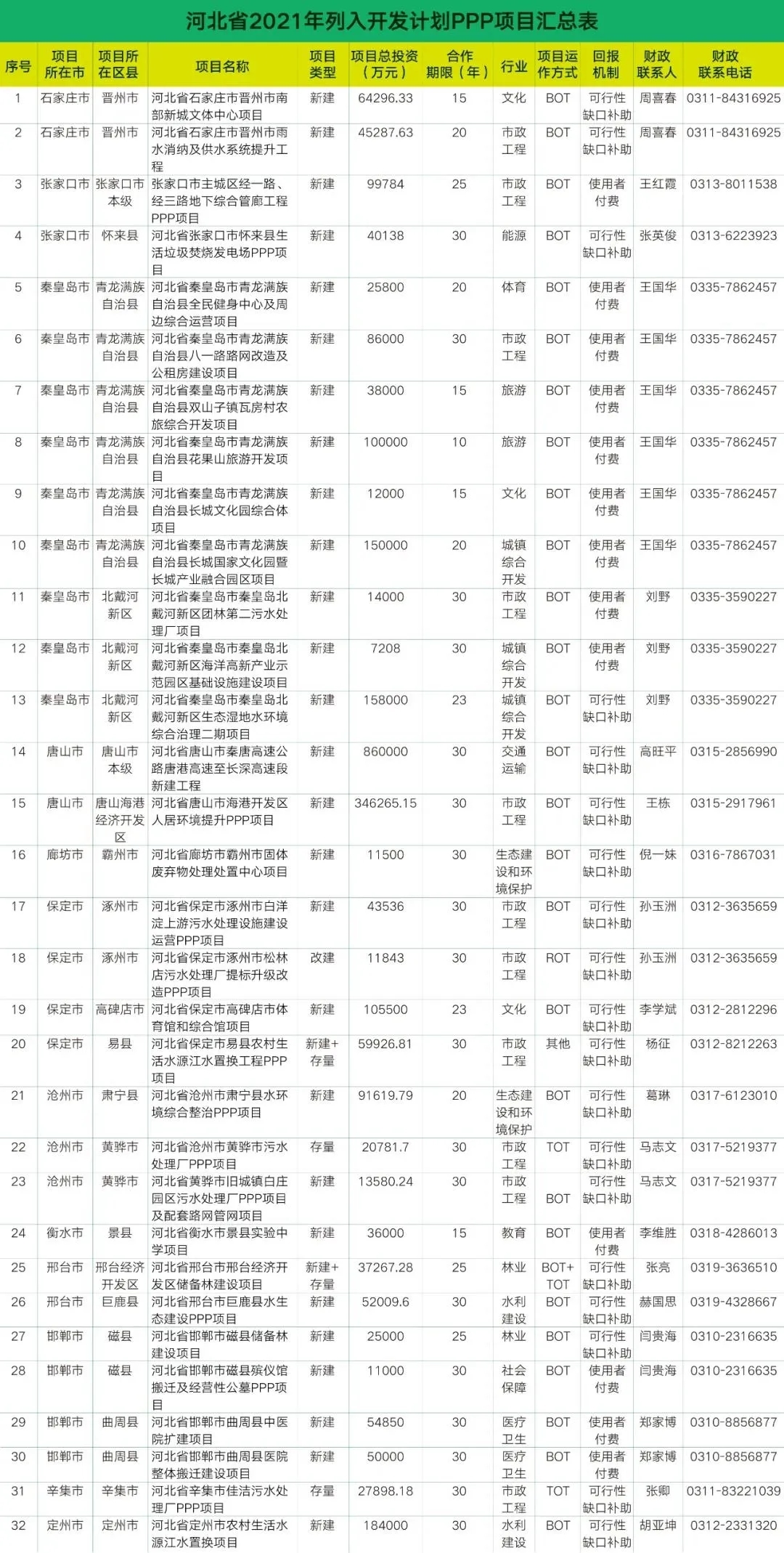 2021年河北各地上報(bào)的政府和社會(huì)資本合作(PPP)項(xiàng)目共32個(gè),投資額288億元。其中,涉環(huán)保項(xiàng)目占比46.8%左右,包括: 1、河北省石家莊市晉州市雨水消納及供水系統(tǒng)提升工程 2、張家口市主城區(qū)經(jīng)一路、經(jīng)三路地下綜合管廊工程PPP項(xiàng)目 3、河北省張家口市懷來縣生活垃圾焚燒發(fā)電廠PPP項(xiàng)目 4、河...
