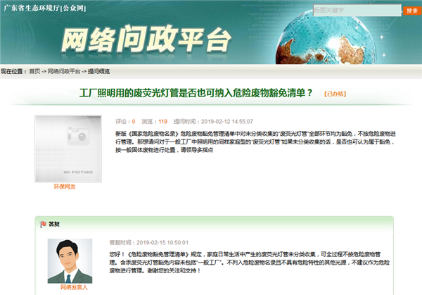 提問(wèn):新版《國(guó)家危險(xiǎn)廢物名錄》危險(xiǎn)廢物豁免管理清單中對(duì)未分類(lèi)收集的“廢熒光燈管”全部環(huán)節(jié)均為豁免,不按危險(xiǎn)廢物進(jìn)行管理。那想請(qǐng)問(wèn)對(duì)于一般工廠中照明用的同樣家庭型的“廢熒光燈管”如果未分類(lèi)收集的話,是否也可認(rèn)為屬于豁免,按一般固體廢物進(jìn)行處置,請(qǐng)領(lǐng)導(dǎo)多指點(diǎn)。答復(fù):您好!《危險(xiǎn)廢物豁免管理清單》規(guī)定,家...