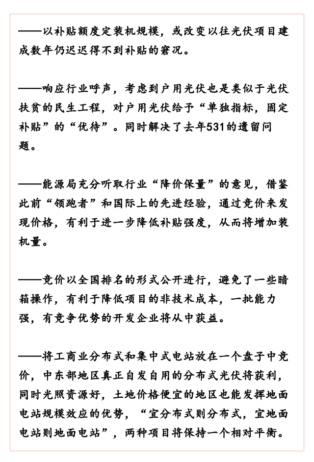 2019年2月18日,國(guó)家能源局新能源司召集相關(guān)企業(yè)舉行座談會(huì),就2019年光伏發(fā)電建設(shè)管理相關(guān)工作征求企業(yè)意見(jiàn)。 隨后,中國(guó)光伏行業(yè)協(xié)會(huì)微信公眾號(hào)發(fā)布相關(guān)內(nèi)容表示,會(huì)議透露今年我國(guó)光伏發(fā)電建設(shè)管理工作將有重大機(jī)制創(chuàng)新。 這七大創(chuàng)新分別是:以補(bǔ)貼額定裝機(jī)量;明確將光伏項(xiàng)目分為需要國(guó)家補(bǔ)貼和不需要國(guó)家...