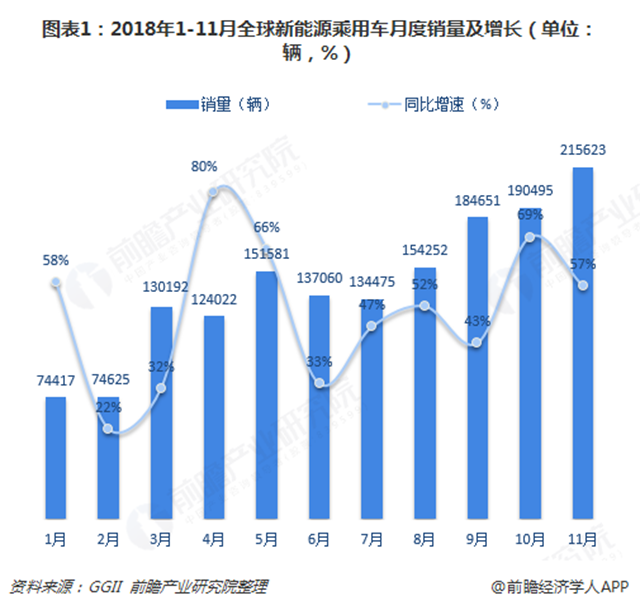 中國(guó)新能源乘用車(chē)市場(chǎng)最大 目前,全球各國(guó)雖然在新能源汽車(chē)研發(fā)側(cè)重點(diǎn)不同,但都制定了較為明確的發(fā)展路線,并且有相對(duì)完善的研發(fā)、推廣體系和一系列政府政策支持。正因此,全球新能源汽車(chē)行業(yè)保持快速發(fā)展態(tài)勢(shì)。 根據(jù)GGII數(shù)據(jù),2018年1-11月,全球新能源乘用車(chē)月度銷(xiāo)量增速均在20%以上。其中,2018年...