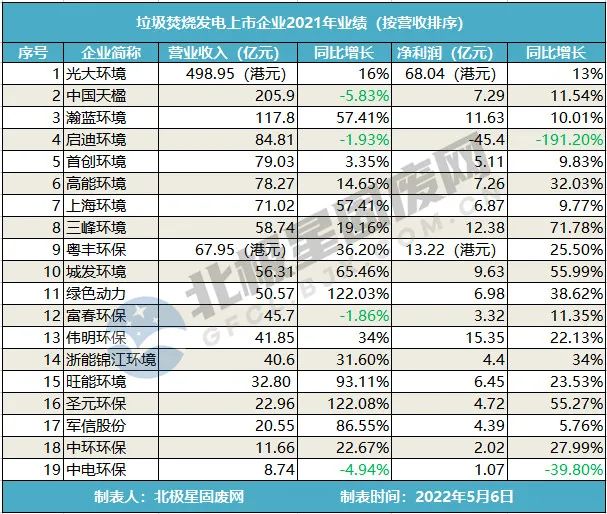 從整體來看,2021年垃圾焚燒發(fā)電企業(yè)發(fā)展態(tài)勢(shì)良好,除啟迪環(huán)境、中電環(huán)保等少數(shù)幾家企業(yè)總營(yíng)收、凈利潤(rùn)同比下滑外,15家企業(yè)均實(shí)現(xiàn)了營(yíng)業(yè)收入、凈利潤(rùn)業(yè)績(jī)雙增長(zhǎng),其中綠色動(dòng)力、圣元環(huán)保營(yíng)業(yè)收入漲幅翻倍。營(yíng)收超50億企業(yè)占比過半,行業(yè)整體發(fā)展勢(shì)頭良好從上表看,光大環(huán)境、中國(guó)天楹、瀚藍(lán)環(huán)境3家企業(yè)營(yíng)業(yè)收入過...