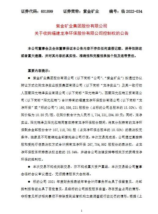 5月9日紫金礦業(yè)公告,擬通過協(xié)議轉(zhuǎn)讓方式收購龍凈實(shí)業(yè)投資集團(tuán)有限公司及其一致行動(dòng)人西藏陽光瑞澤實(shí)業(yè)有限公司、西藏陽光泓瑞工貿(mào)有限公司合計(jì)持有的福建龍凈環(huán)保股份有限公司1.606億股股份(占標(biāo)的公司總股本的15.02%),收購價(jià)格為10.80元/股,收購價(jià)款合計(jì)為人民幣17.34億元。同時(shí),龍凈實(shí)業(yè)、...