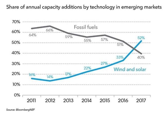 電力需求的激增、技術(shù)成本的下降以及政策制定的創(chuàng)新已使發(fā)展中國家取代發(fā)達國家,成為全球清潔能源的領(lǐng)導者。截止到2017年,發(fā)展中國家新增了114GW的各類零碳發(fā)電機,僅風電和太陽能新增發(fā)電裝機規(guī)模就達到歷史新高的94GW。同時,新增燃煤發(fā)電裝機規(guī)模為2006年以來最低。2017年新建煤電裝機量為48G...