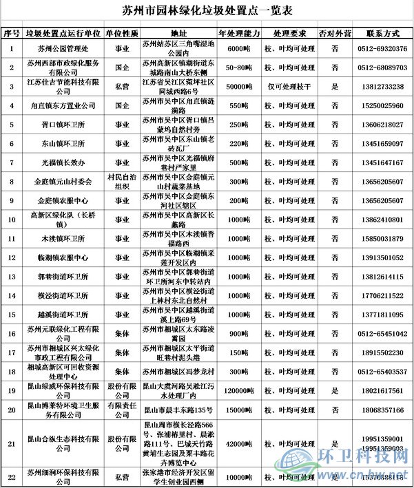 環(huán)衛(wèi)科技網(wǎng)訊,10月18日,蘇州市園林和綠化管理局在網(wǎng)上發(fā)布《蘇州市園林綠化垃圾處置點信息公示》,公示顯示,蘇州共有22個園林綠化垃圾處置點運行單位,年處理能力達25.24余萬噸。22個運行單位中,有4家公司(兩家股份有限公司,兩家私營單位)對外營運,年處理能力總計22.2萬噸。 下表為整理《蘇州發(fā)...