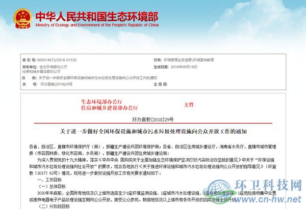 9月18日,生態(tài)環(huán)境部辦公廳與住房和城鄉(xiāng)建設部辦公廳聯(lián)合印發(fā)《關于進一步做好全國環(huán)保設施和城市污水垃圾處理設施向公眾開放工作的通知》(以下簡稱《通知》)?!锻ㄖ芬?,2020年年底前,全國所有地級及以上城市選擇至少1座環(huán)境監(jiān)測設施、1座城市污水處理設施、1座垃圾處理設施、1座危險廢物集中處置或廢棄...