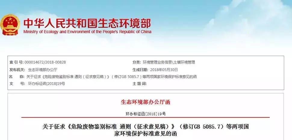 生態(tài)環(huán)境部發(fā)函就《危險廢物鑒別標(biāo)準(zhǔn) 通則》和《危險廢物鑒別技術(shù)規(guī)范》的修訂征求意見