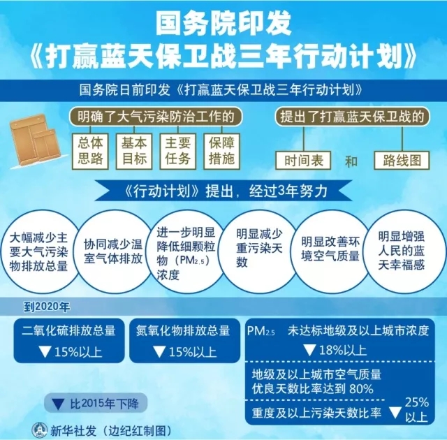 國務(wù)院印發(fā)《打贏藍(lán)天保衛(wèi)戰(zhàn)三年行動計劃》,提出打贏藍(lán)天保衛(wèi)戰(zhàn)的時間表和路線圖