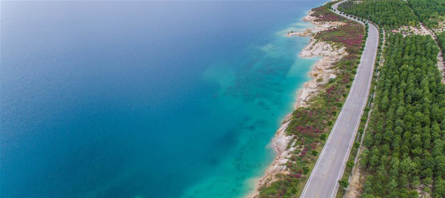 在位于廣東茂名市區(qū)西北角的露天礦,60多歲的退休市民陳阿姨站在一座歐式小木屋下乘涼。眼前是一片寬闊清澈的湖水,湖的兩岸樹木蔥蘢、綠草茵茵。而在四年前,這里還是一個(gè)被廢棄的油頁巖大礦坑,垃圾遍地、污水橫流,被當(dāng)?shù)厝送葱牡胤Q為這座城市的“傷疤”。這是茂名露天礦生態(tài)公園中的湖邊公路(8月17日攝)。上圖:...