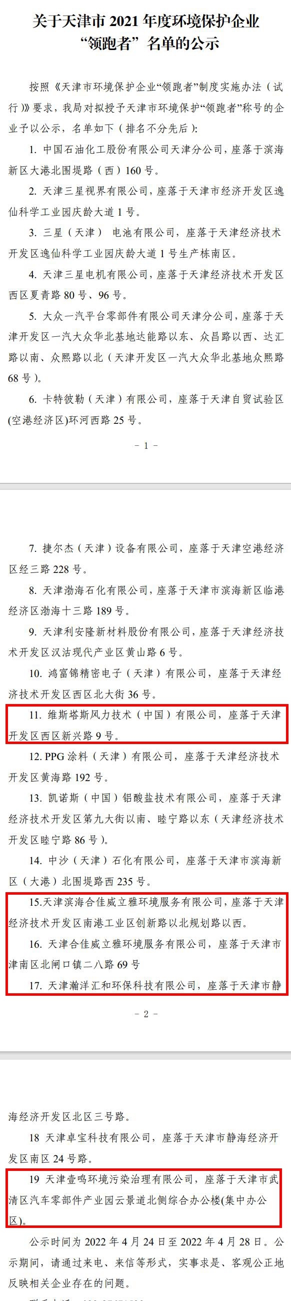 2022年4月24日至4月28日是天津2021年環(huán)保企業(yè)領(lǐng)跑者名單公示期,涉及19家企業(yè),包括維斯塔斯風(fēng)力技術(shù)(中國(guó))有限公司、天津?yàn)I海合佳威立雅環(huán)境服務(wù)有限公司、天津合佳威立雅環(huán)境服務(wù)有限公司、天津瀚洋匯和環(huán)??萍加邢薰竞吞旖蛞鉴Q環(huán)境污染治理有限公司。