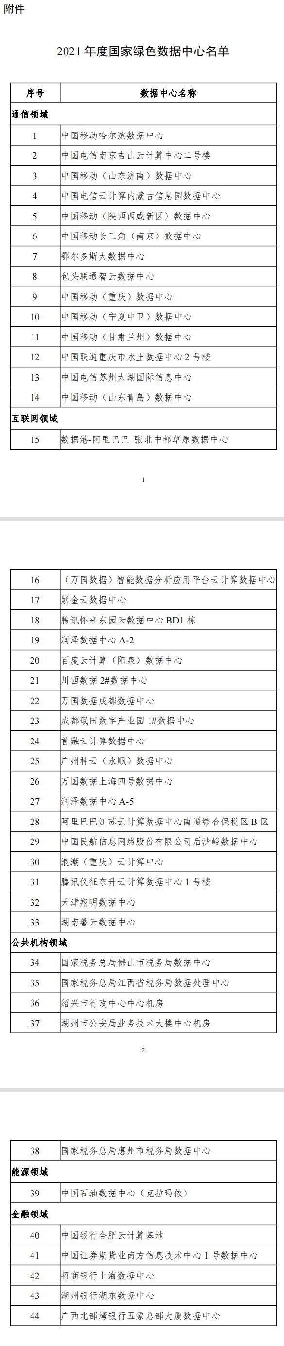 工業(yè)和信息化部等六部門公告 2022年第7號 為加快數(shù)據(jù)中心節(jié)能和能效提升,引導(dǎo)數(shù)據(jù)中心走高效、低碳、集約、循環(huán)的綠色發(fā)展道路,助力實(shí)現(xiàn)碳達(dá)峰、碳中和目標(biāo),工業(yè)和信息化部、國家發(fā)展和改革委員會、商務(wù)部、國家機(jī)關(guān)事務(wù)管理局、中國銀行保險(xiǎn)監(jiān)督管理委員會、國家能源局確定了44家2021年度國家綠色數(shù)據(jù)中心...