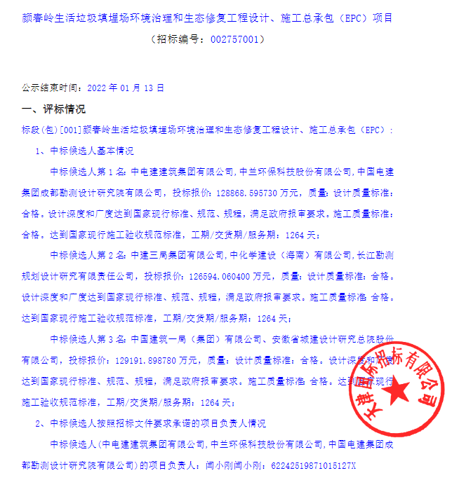 日前,中國(guó)招標(biāo)投標(biāo)公共服務(wù)平臺(tái)發(fā)布海南省顏春嶺生活垃圾填埋場(chǎng)環(huán)境治理和生態(tài)修復(fù)工程設(shè)計(jì)、施工總承包(EPC)項(xiàng)目中標(biāo)公示,中電建建筑集團(tuán)有限公司、中蘭環(huán)??萍脊煞萦邢薰竞椭袊?guó)電建集團(tuán)成都勘測(cè)設(shè)計(jì)研究院有限公司組成的聯(lián)合體中標(biāo)該項(xiàng)目,中標(biāo)金額約12.9億元。 來(lái)源 | 環(huán)衛(wèi)科技網(wǎng)(ID: cnhua...