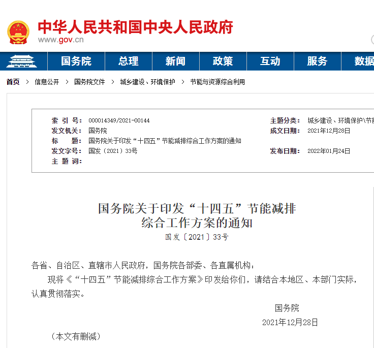 近日,國(guó)務(wù)院印發(fā)《“十四五”節(jié)能減排綜合工作方案》(以下簡(jiǎn)稱(chēng)《方案》),對(duì)“十四五”期間節(jié)能減排目標(biāo)做出部署,并部署十大重點(diǎn)工程作為節(jié)能減排重點(diǎn)領(lǐng)域。 《方案》明確,到2025年,全國(guó)單位國(guó)內(nèi)生產(chǎn)總值能源消耗比2020年下降13.5%,能源消費(fèi)總量得到合理控制,化學(xué)需氧量、氨氮、氮氧化物、揮發(fā)性有機(jī)...
