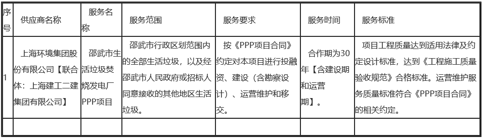 邵武市生活垃圾焚燒發(fā)電廠(chǎng)PPP項(xiàng)目發(fā)布中標(biāo)公告,上海環(huán)境集團(tuán)股份有限公司聯(lián)合上海建工二建集團(tuán)有限公司中標(biāo)該項(xiàng)目。 詳情如下: 一、項(xiàng)目編號(hào):FJTP-00092118015206(招標(biāo)文件編號(hào):FJTP-00092118015206)二、項(xiàng)目名稱(chēng):邵武市生活垃圾焚燒發(fā)電廠(chǎng)PPP項(xiàng)目三、中標(biāo)(成交)信...