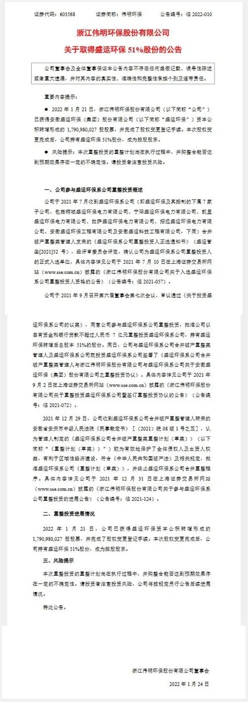 日前,偉明環(huán)保發(fā)布公告,該公司已獲得安徽盛運(yùn)環(huán)保(集團(tuán))股份有限公司(以下簡(jiǎn)稱(chēng)“盛運(yùn)環(huán)?!?資本公積轉(zhuǎn)增形成的17.91億股股票,并完成了股權(quán)變更登記手續(xù)。 2022年1月21日,浙江偉明環(huán)保股份有限公司獲得安徽盛運(yùn)環(huán)保(集團(tuán))股份有限公司(以下簡(jiǎn)稱(chēng)“盛運(yùn)環(huán)?!保┵Y本公積轉(zhuǎn)增形成的逾17.9億股股票...