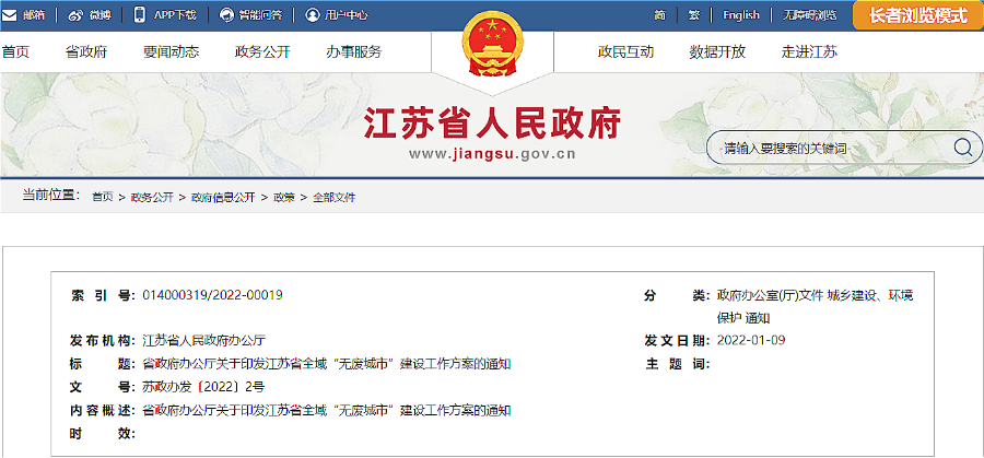 日前,《江蘇省全域“無廢城市”建設工作方案》印發(fā),《方案》指出,到2025年,完成全域“無廢城市”建設任務,4個以上設區(qū)市建成國家“無廢城市”。到2030年,所有設區(qū)市均達到國家“無廢城市”建設要求。 省政府辦公廳關于印發(fā)江蘇省全域“無廢城市”建設工作方案的通知 (蘇政辦發(fā)〔2022〕2號) 各市、...