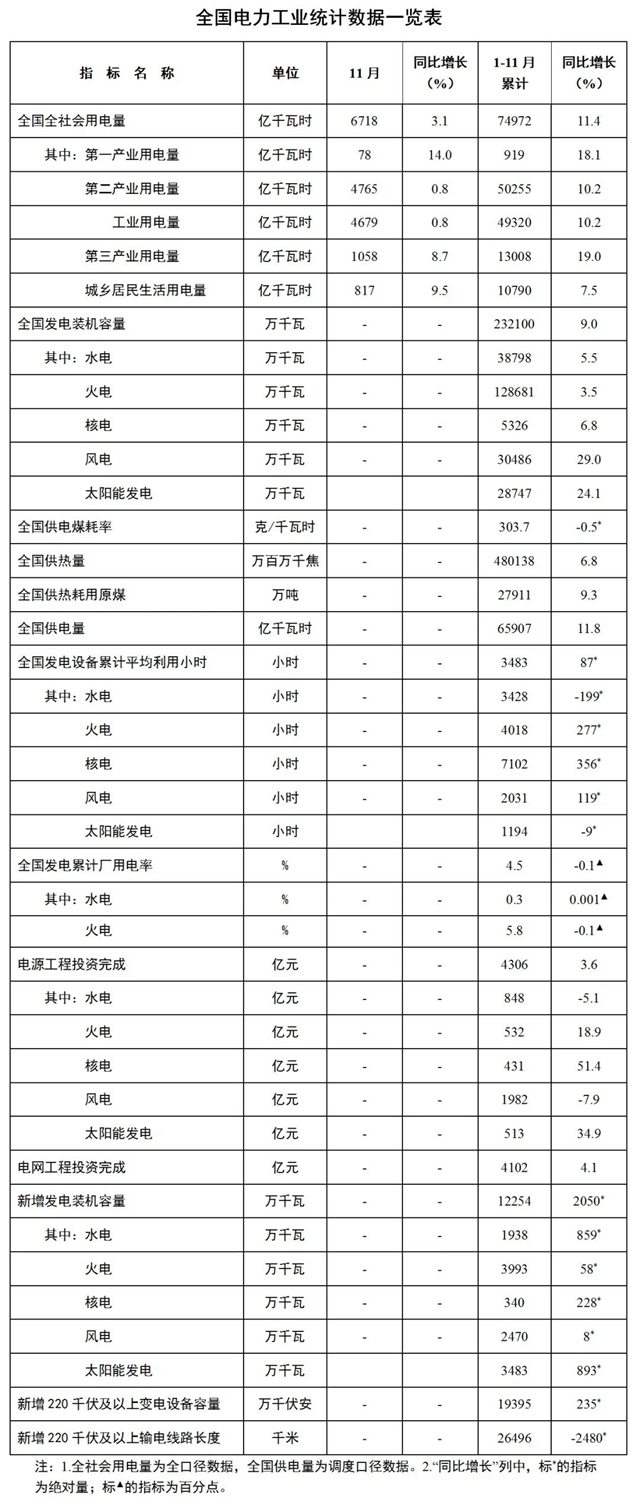 2021年12月17日,國家能源局發(fā)布1-11月份全國電力工業(yè)統(tǒng)計數(shù)據(jù)。截至11月底,全國發(fā)電裝機容量約23.2億千瓦,同比增長9.0%。其中,風電裝機容量約3.0億千瓦,同比增長29%;太陽能發(fā)電裝機容量約2.9億千瓦,同比增長24.1%。 1-11月份,全國發(fā)電設(shè)備累計平均利用3483小時,比上...