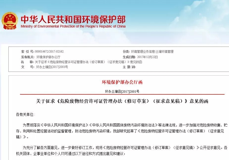 環(huán)境保護(hù)部公布的“關(guān)于征求《危險(xiǎn)廢物經(jīng)營(yíng)許可證管理辦法(修訂草案)(征求意見(jiàn)稿)》意見(jiàn)的函(環(huán)辦土壤函[2017]2001號(hào)),其中,第三十九條 以下危險(xiǎn)廢物利用或者處置活動(dòng)免于領(lǐng)取危險(xiǎn)廢物經(jīng)營(yíng)許可證:(一)產(chǎn)生危險(xiǎn)廢物的單位在其廠(chǎng)區(qū)(場(chǎng)所)內(nèi),自行或者委托第三方專(zhuān)業(yè)機(jī)構(gòu)對(duì)本單位產(chǎn)生的危險(xiǎn)廢物進(jìn)行利...
