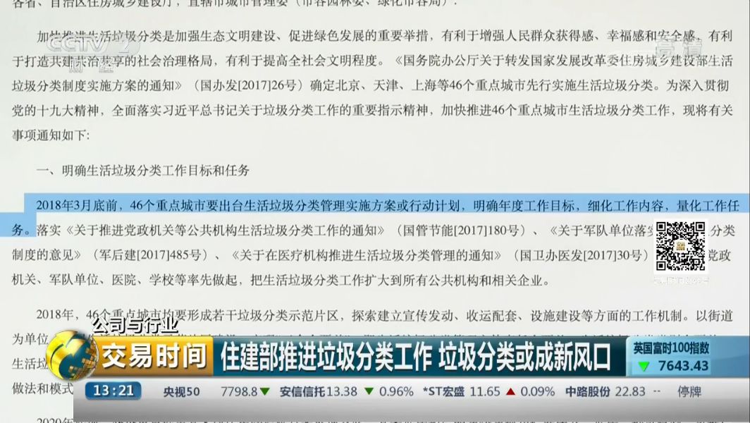 隨著2017年成為環(huán)保政策爆發(fā)年之后,環(huán)保板塊活躍度一度攀升,其中2017年7月18日至10月13日,指數(shù)上漲17.09%,跑贏同期上證綜指10.35個(gè)百分點(diǎn)。2017年底,住建部發(fā)文要求加快推進(jìn)46個(gè)重點(diǎn)城市的工作。那么垃圾的分類(lèi)回收、處理會(huì)給企業(yè)帶來(lái)哪些新的商機(jī)呢?住建部推進(jìn)垃圾分類(lèi)工作 垃圾分...
