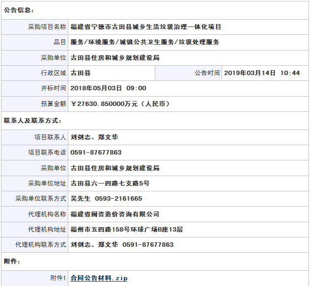 福建省閩咨造價(jià)咨詢有限公司受古田縣住房和城鄉(xiāng)規(guī)劃建設(shè)局委托,根據(jù)《中華人民共和國政府采購法》等有關(guān)規(guī)定,現(xiàn)對(duì)福建省寧德市古田縣城鄉(xiāng)生活垃圾治理一體化項(xiàng)目進(jìn)行其他招標(biāo),歡迎合格的供應(yīng)商前來投標(biāo)。項(xiàng)目名稱:福建省寧德市古田縣城鄉(xiāng)生活垃圾治理一體化項(xiàng)目項(xiàng)目編號(hào):閩咨招[2018]12號(hào)項(xiàng)目聯(lián)系方式:項(xiàng)目聯(lián)...